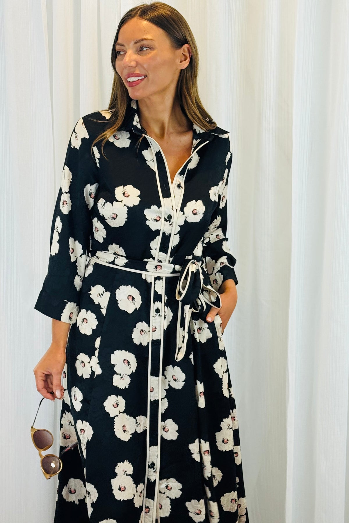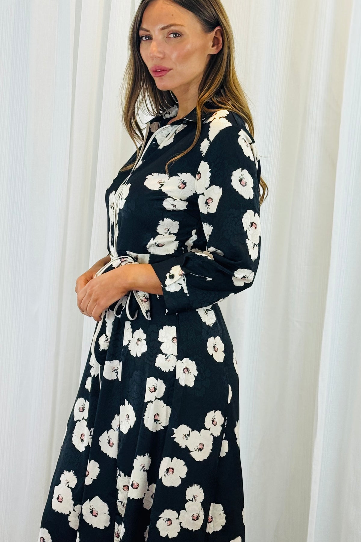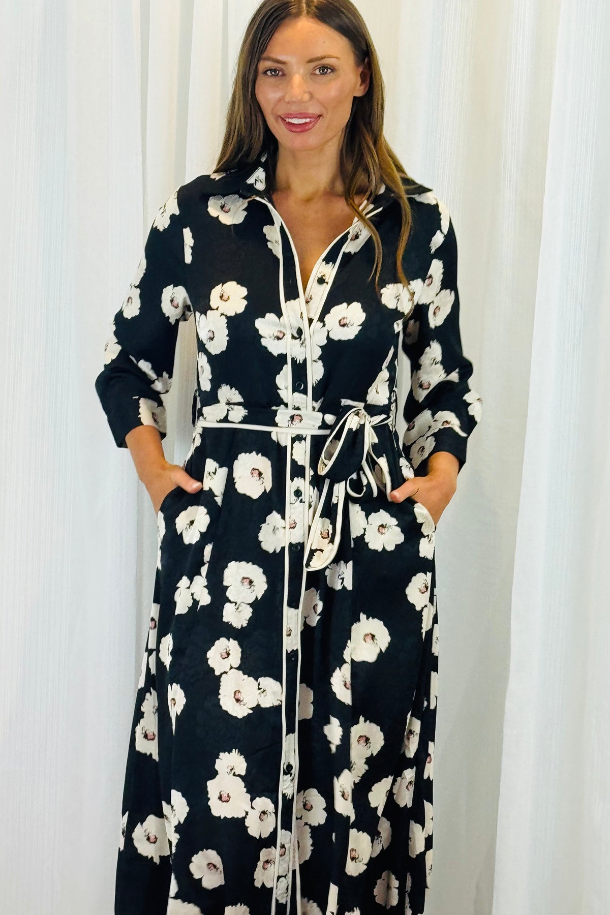 Our new black floral shirt dress  is stylish, a lightweight silky fabric, It will be your favourite dress every season. A gorgeous feminine floral print with all the  extra trimmings comes with a matching tie waste belt,  has pockets, and is going to be perfect for all those upcoming events.