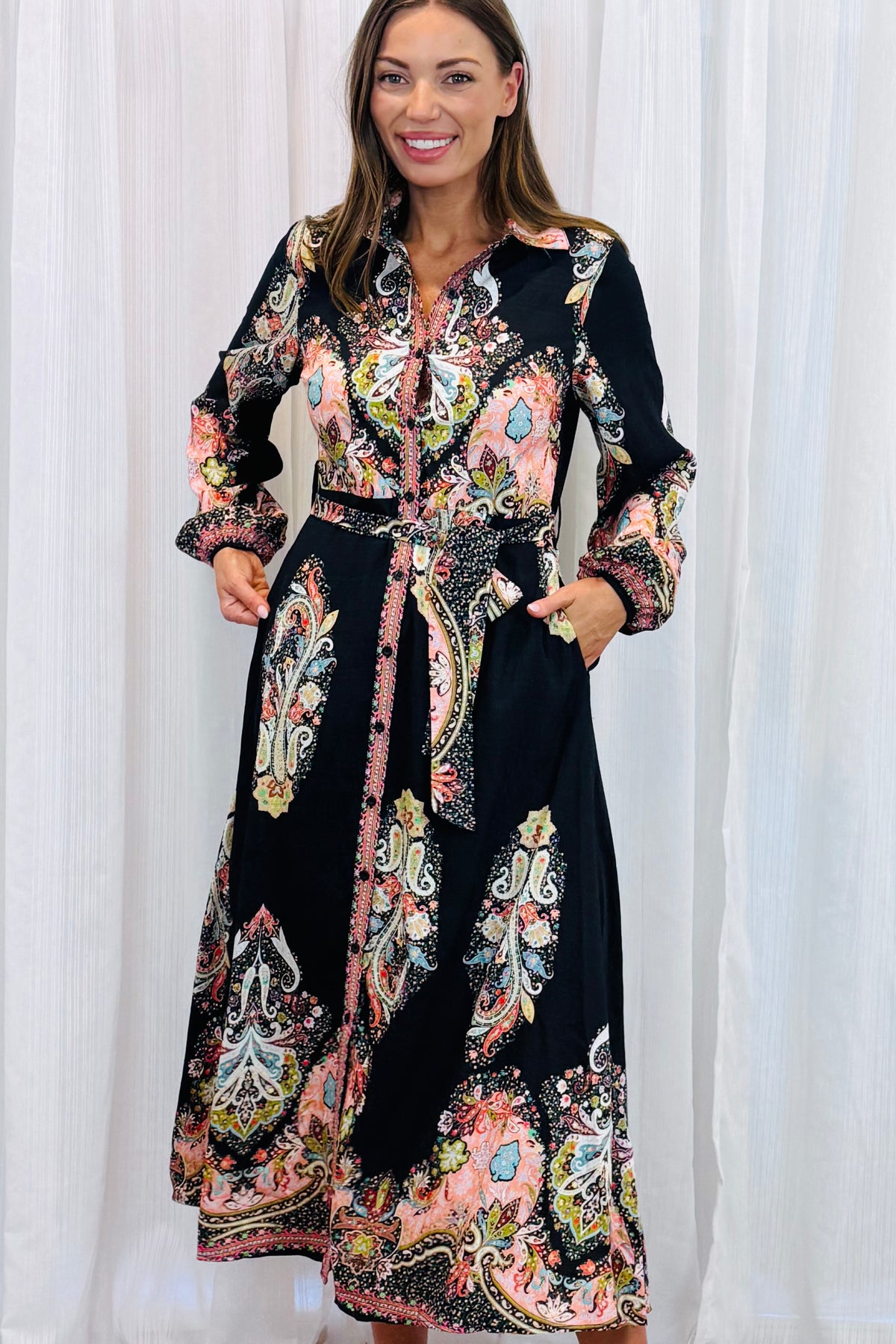This stunning long sleeve black embroidered print maxi shirt dress is an absolute showstopper. A perfect style that will be a timeless piece in your wardrobe. A style that you can brunch in ,wear out to dinner or dress it up for a day or night function .Soft tones of colours complement the black background to create a feminine style with fabric waist belt and pockets.