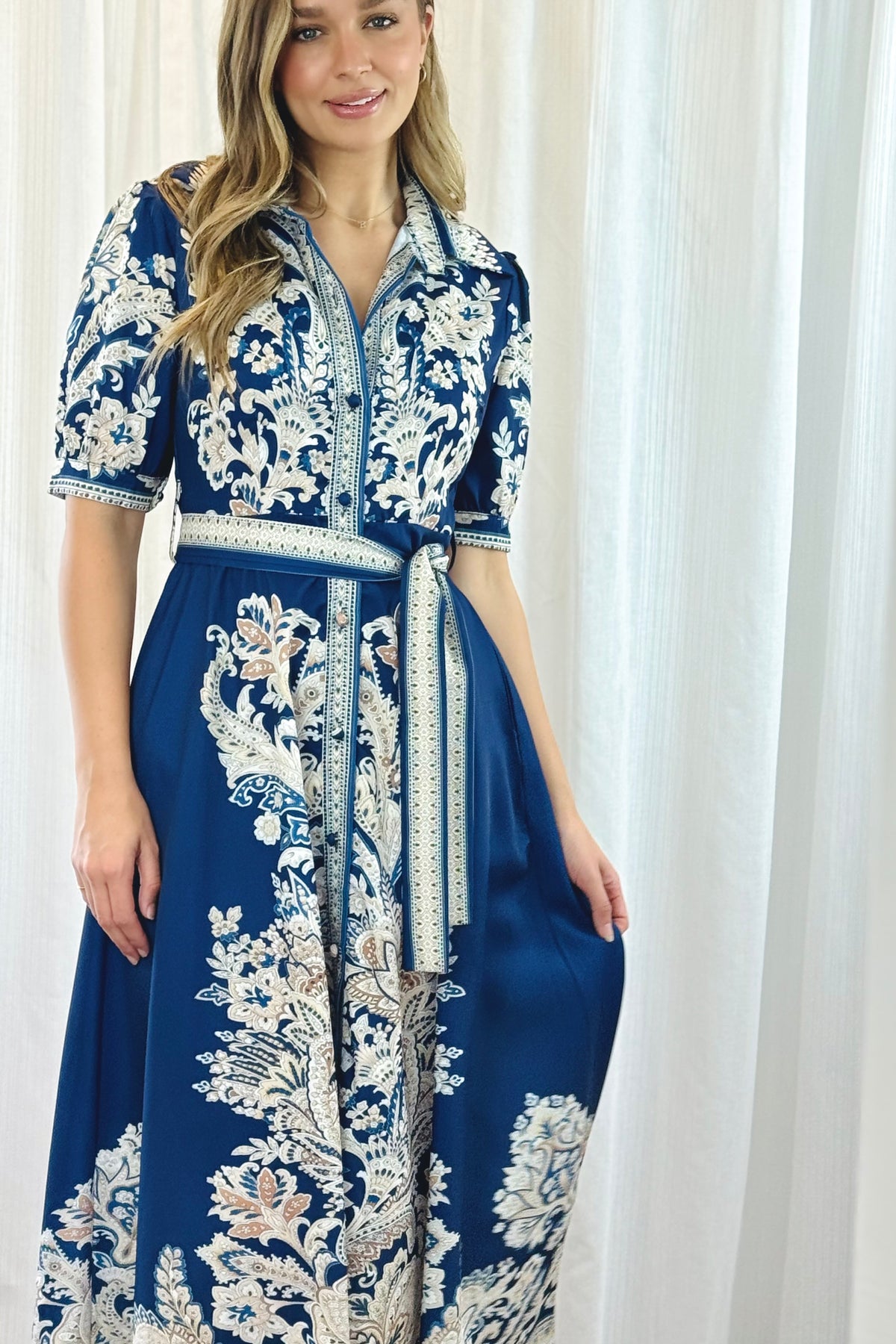 The Lopez is an absolute spring stunner. It’s delicate embroidered print set on a navy background. This style will be something you will love to wear and feel absolutely amazing in. Gorgeous detail midi dress with a 3/4 elasticised sleeve, a belt to accentuate the waistline, such a flattering design. Perfect style for that next occasion.