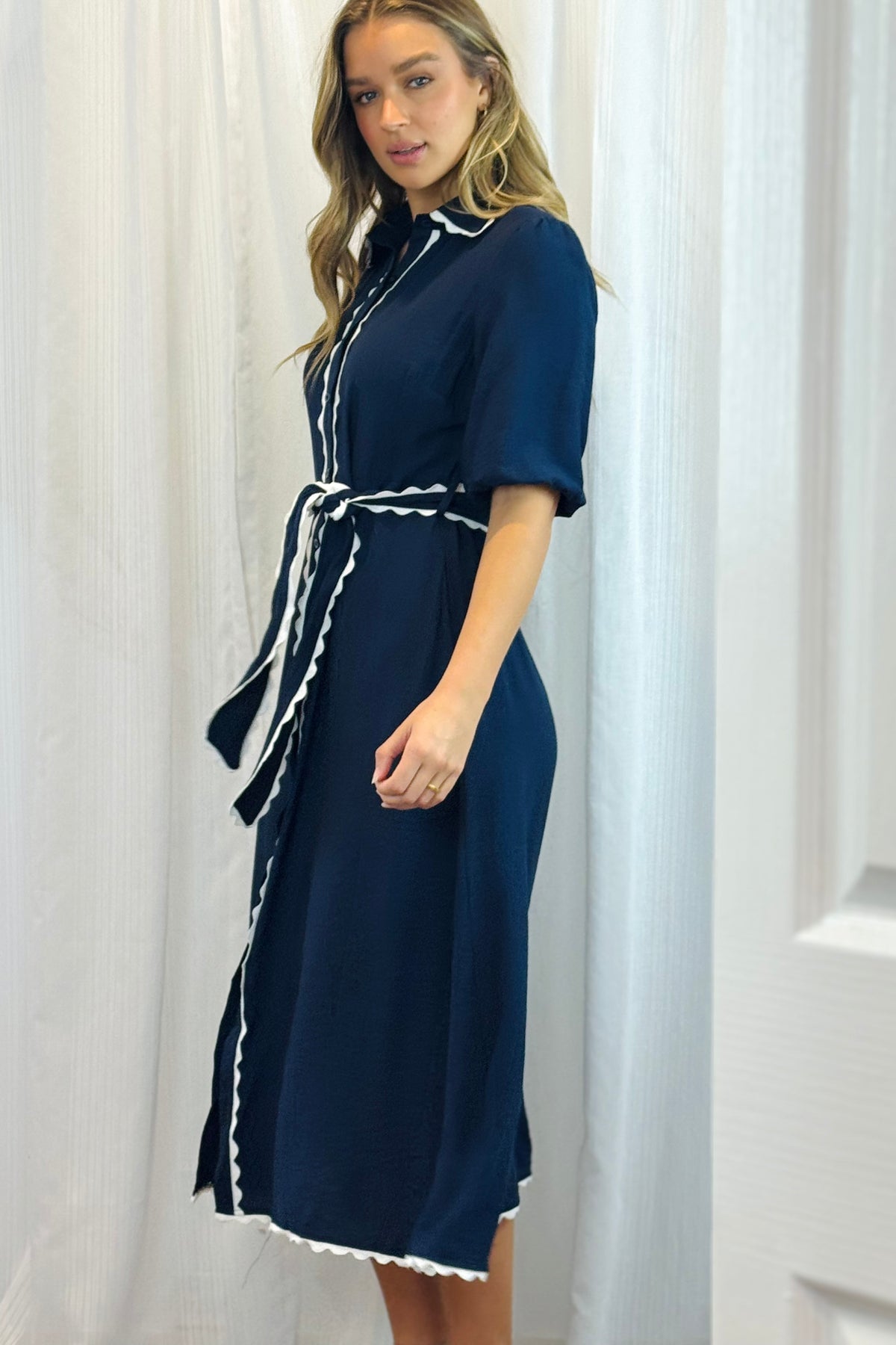 Turn heads in our new arrival. The Shyla short sleeve midi in navy with a stunning waist belt to enhance the waistline and gorgeous detailing through out the dress with white trimming.Its chic, on-trend and easy to wear day or night, match it back with heels or boots.