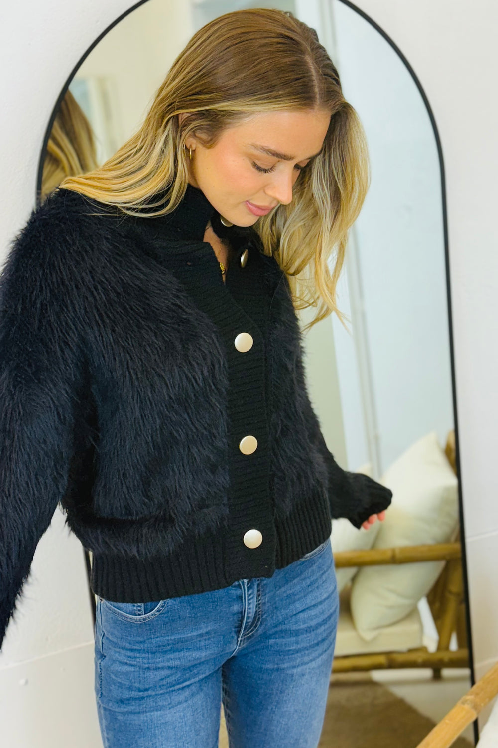 Loose Fit Short fluffy cardigan in Black with buttons down the front. Ribbed detail around the collar, neckline, band and cuffs . This style Looks great with any outfit, it’s super soft, cosy and fluffy. It will be your new favourite this season.